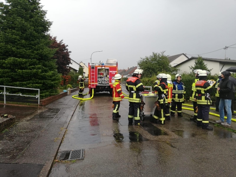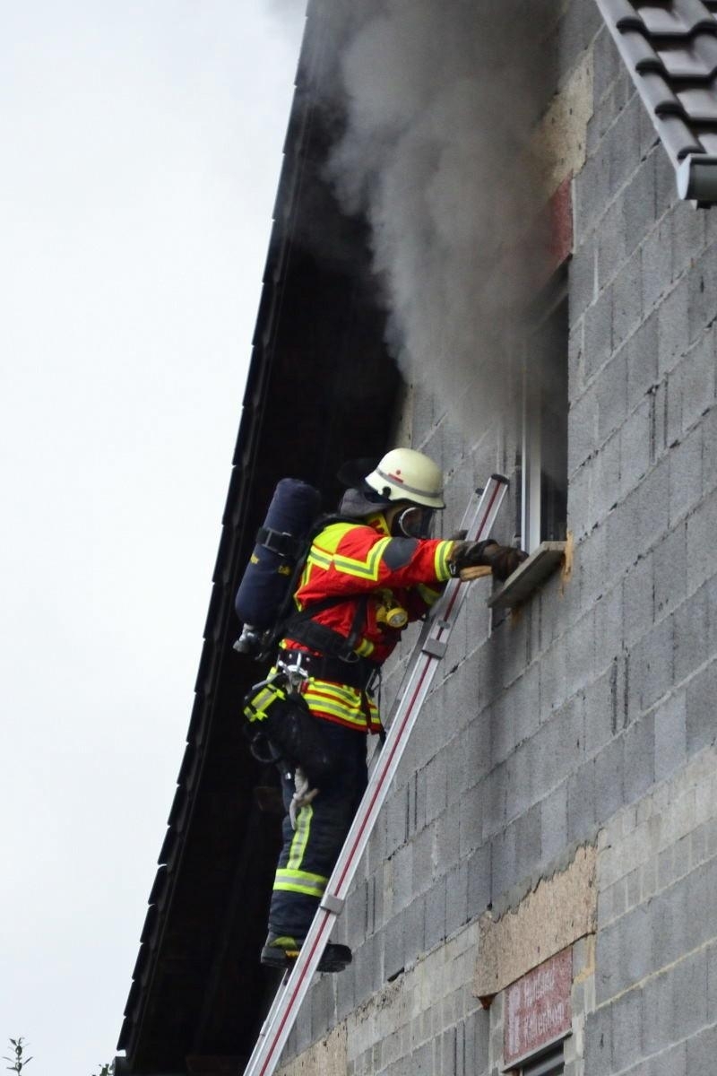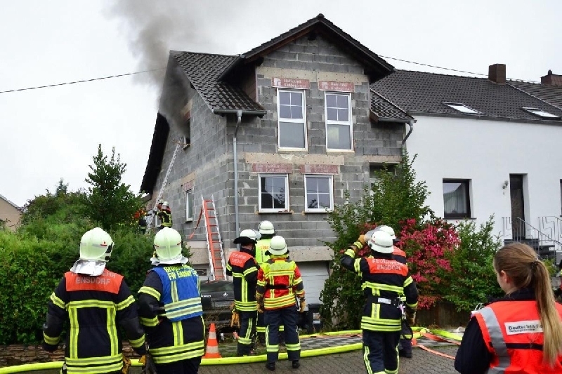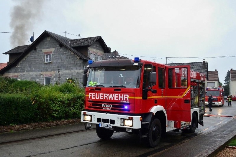 Am 06.10.2019 wurde die Feuerwehr Ensdorf um 17:08 Uhr in die Schanzenstraße zu einem gemeldeten Brand 3, mit dem Meldebild Brennt 1. OG alarmiert. Da auf der Anfahrt der beiden Löschfahrzeuge schon eine deutliche Rauchentwicklung sichtbar war, wurde zeitnah die Feuerwehr Saarlouis mit der Teleskopleiter nachalarmiert. Dichter Rauch drang aus dem Obergeschoß, weshalb der erste Angriffstrupp sich mithilfe einer Steckleiter über einen Garagenanbau Zugang zu einem der oberen Fenster verschaffte. Zeitgleich wurde das, zu einer Garage im Gebäude gehörende, Tor geöffnet. Da man durch diese zweite Öffnung Zugang zum Gebäudeinneren hatte, ging ein zweiter Angriffstrupp zur Personensuche in das Gebäude vor. Zeitgleich wurde mit Hilfe eines Feuerwehrlüfters die Belüftung durch die Haustür vorbereitet. Nachdem beide Angriffstrupps das Gebäude durchsucht hatten und keine Person auffinden konnten, wurde das Feuer bekämpft und das Gebäude durchgelüftet. Der Bewohner des Nachbarhauses erlitt einen Schock und wurde medizinisch durch den Rettungsdienst betreut. Er konnte noch vor Ort aus der medizinischen Behandlung entlassen werden. Nachdem das Gebäude an die Polizei übergeben wurde konnte die Feuerwehr Ensdorf den Einsatz beenden. Vor Ort war die Feuerwehr Ensdorf mit allen Fahrzeugen, die Feuerwehr Saarlouis mit drei Fahrzeugen, der Rettungsdienst mit einem RTW, die Polizeiinspektion Saarlouis mit einem Streifenwagen und der Kriminaldienst der Polizei mit einem zivilen Einsatzfahrzeug.